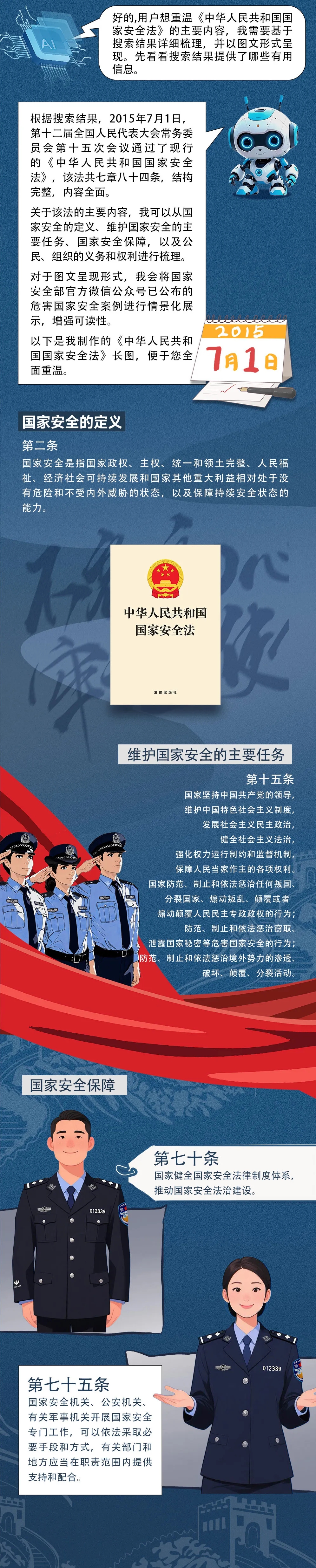 今年是《中华人民共和国国家安全法》颁布实施10周年。2015年7月1日,第十二届全国人民代表大会常务委员会第十五次会议审议通过新的《中华人民共和国国家安全法》。十年来,该法有力保障了总体国家安全观贯彻落实,有力促进了国家安全体系和能力现代化。下面,让我们一同回顾该法主要内容,共同增强国家安全意识,凝聚起全社会维护国家安全的强大合力