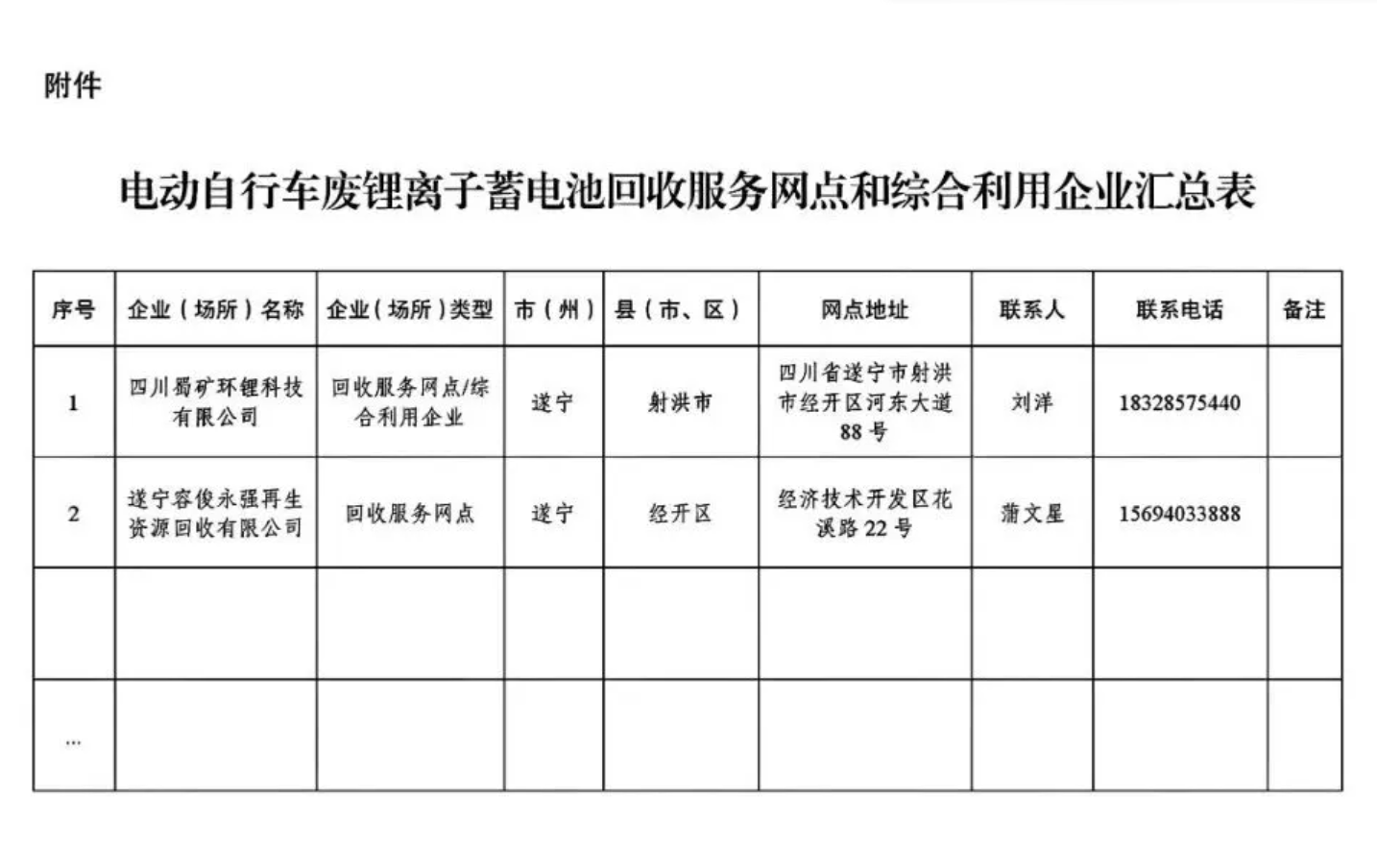 关于遂宁市电动自行车废锂离子蓄电池回收服务网点和综合利用企业信息(第一批)的公告