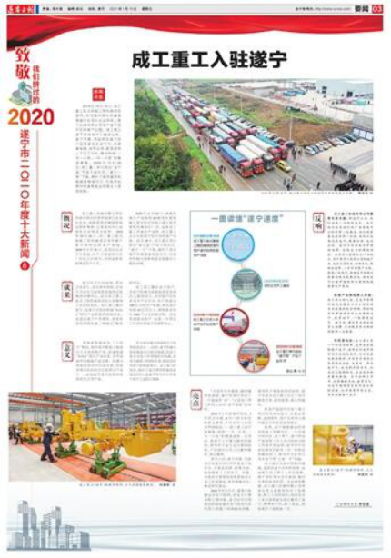 2020年11月29日,满载机械生产设备的48辆货车缓缓驶入遂宁经开区成工重工轮式装载机械项目厂区,运抵成工重工首批生产设备,成工重工正式入驻遂宁经开区欧美产业园。12月28日,成工重工举行首台“遂宁造”产品下线仪式。“遂宁一号”下线,填补了我市重型机械装备制造空白,为我市机械与装备制造业发展注入强劲动能。