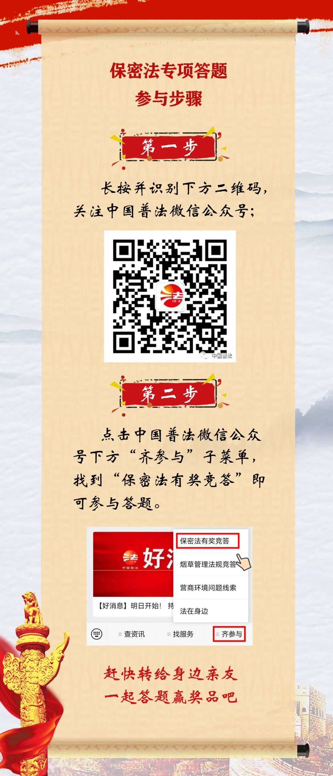关注“中国普法”微信公众号,在手机下方子菜单“齐参与”中找到“保密法有奖竞答”进入答题页面即可答题。