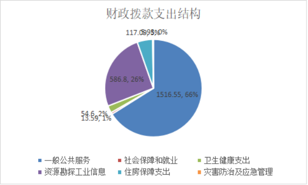 2020年一般公共预算财政拨款支出2496.16万元,主要用于以下方面:一般公共服务(201)支出1516.55万元,占60.76%;社会保障和就业(208)支出215.2万元,占8.62%;卫生健康支出(210)54.6万元,占2.19%;资源勘探工业信息等支出(215)586.8万元,占23.5%;住房保障支出(221)117.09万元,占4.69%;灾害防治及应急管理支出(224)5.93万元,占0.24%。
