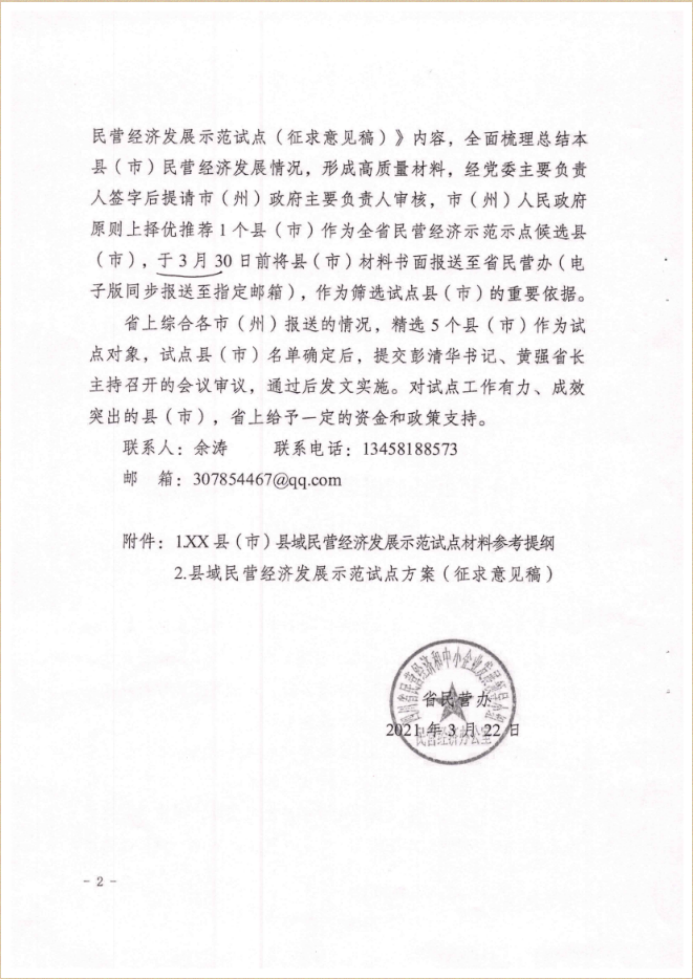 省民营办拟在全省选择5个县(市)开展县域民营经济发展示范试点工作,并印发了《县域民营经济发展示范试点方案(征求意见稿)》,请各地民营经济和中小企业发展领导小组办公室高度重视,结合自身实际决定是否参与示范试点,同时对县域民营经济发展示范试点方案(征求意见稿)》提出修改意见。请决定参与示范试点的县(市),于3月29日前将经县(市)委主要负责人签字后的资料提交市民营办,市民营办审定后报市政府审定上报。联系人:李龙川,联系电话:2254232。