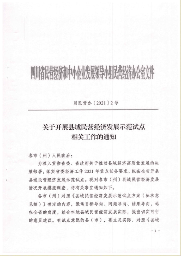 附件:《省民营办关于开展县域民营经济发展示范试点相关工作的通知》(川民营办〔2021〕2号)