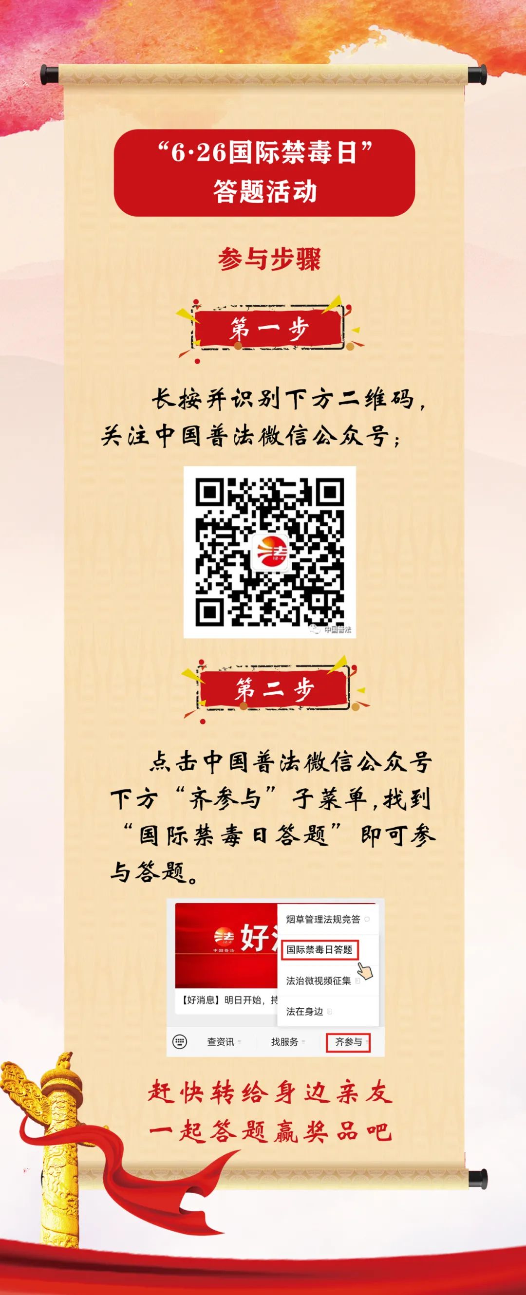 关注“中国普法”微信公众号,点击微信公众号右下角子菜单“齐参与”—“国际禁毒日答题”即可参与答题。参与者在答题前要准确填写答题者的姓名、手机号、详细地址(个人信息仅公众号编辑可见)。